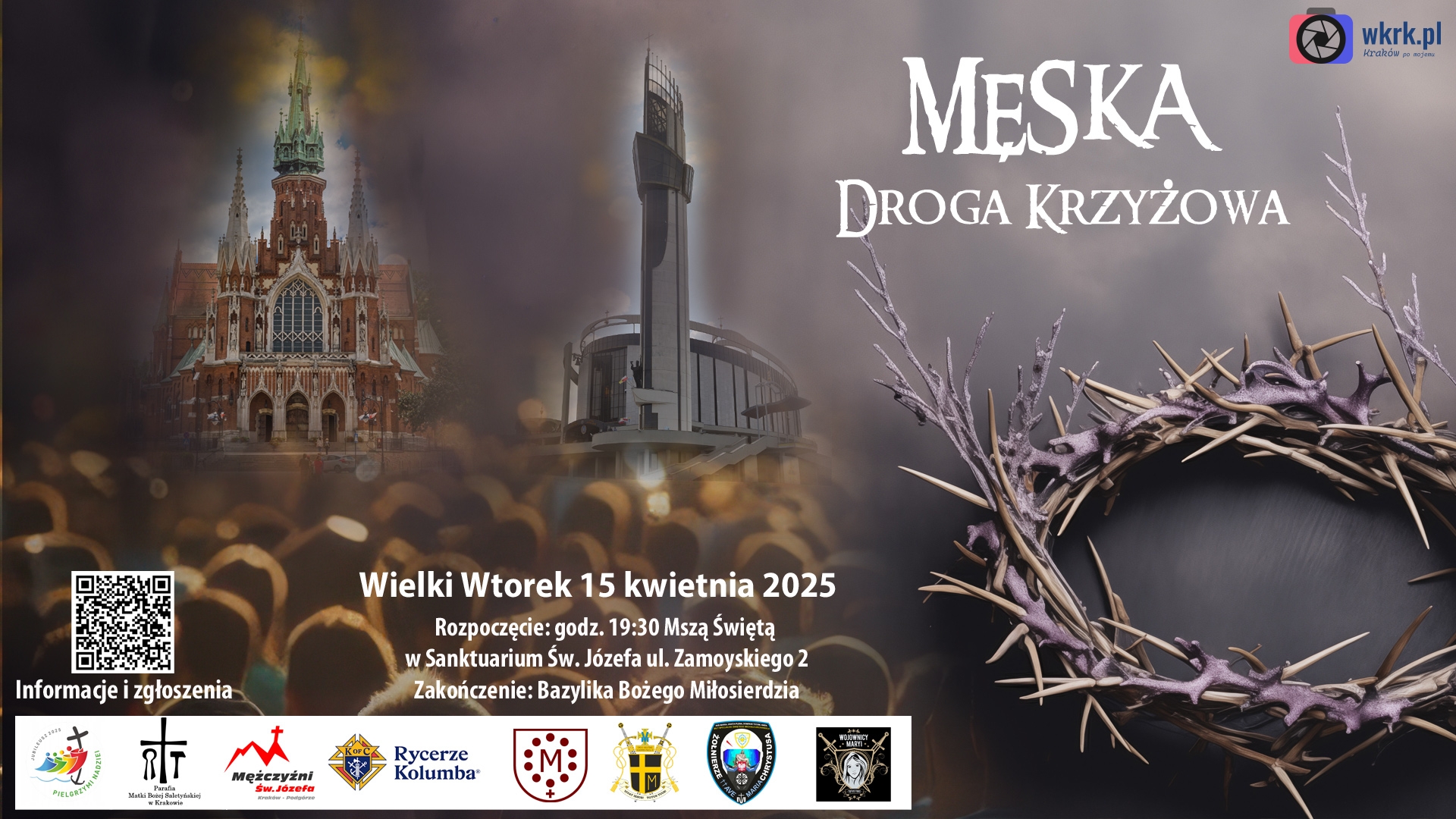 Z okazji 20 rocznicy śmierci Świętego Jana Pawła II oraz Misterium  Paschalnego zapraszamy mężczyzn do uczestnictwa w nabożeństwie Drogi Krzyżowej która odbędzie się w Wielki Wtorek 15 kwietnia 2025. Spotkanie rozpocznie się Mszą Świętą o godz. 19:30 w Sanktuarium Św. Józefa w Krakowie Zamoyskiego 2 a zakończy w Sanktuarium Bożego Miłosierdzia w Łagiewnikach. Jest to inicjatywa grup męskich działających na terenie archidiecezji krakowskiej tj.  Mężczyzn św. Józefa, Rycerzy św. Jana Pawła II, Rycerzy Kolumba, Męskiego Różańca, Wojowników Maryi. Szczegóły na plakacie.