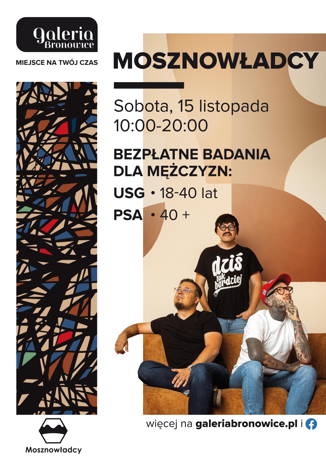 W sobotę, 15 listopada, w godz. 10:00–20:00 panowie powyżej 18. roku życia będą mogli wziąć udział w bezpłatnych badaniach w ramach ogólnopolskiej kampanii Mosznowładcy, prowadzonej pod hasłem „Robimy to dla jaj!”. Wydarzenie odbędzie się na parterze Galerii Bronowice, gdzie stanie podwójny mobilny gabinet USG oraz stanowisko do badań poziomu PSA. Udział nie wymaga zapisów ani przygotowania.