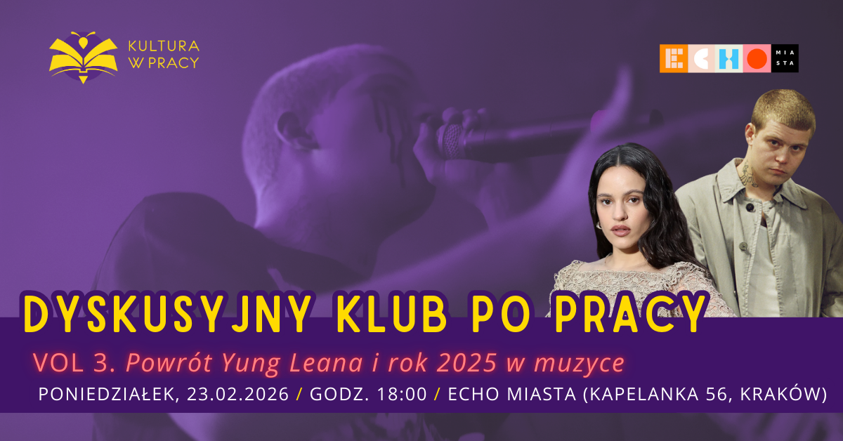 Cały ten hałas przyćmił nieco nowy album Jonatana Leandoera, który “wrócił” do ksywki Yung Lean (na tyle szybko, że wielu słuchaczy przegapiło odejście od niej) i zaprezentował nienajlepiej przyjęty, ale z kilku względów wściekle ciekawy album Jonatan. O tychże względach, a także o szerszej kondycji tzw. muzyki popularnej na początku 2026 roku, porozmawiamy w poniedziałek 23 lutego na trzecim spotkaniu Dyskusyjnego Klubu Po Pracy. Jak zwykle widzimy się w Echu Miasta na Kapelance 56.