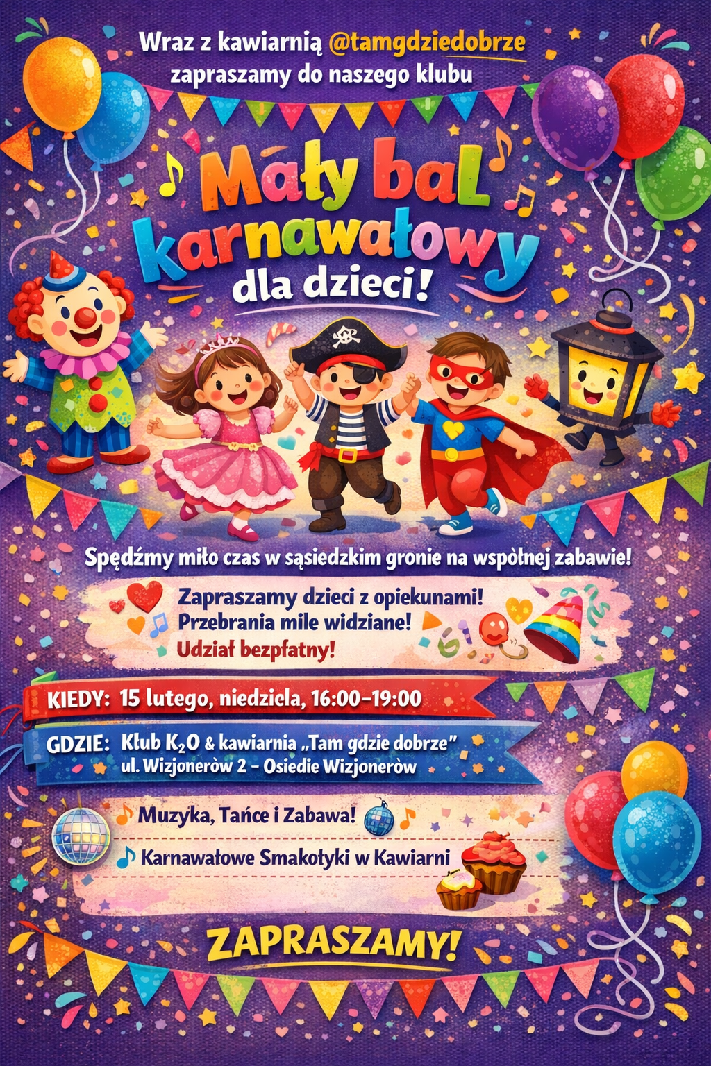 Wraz z kawiarnią @tamgdziedobrze dobrze zapraszamy do naszego klubu na Mały bal karnawałowy dla dzieci 🎶 Spędźmy miło czas w sąsiedzkim gronie na wspólnej zabawie 😊