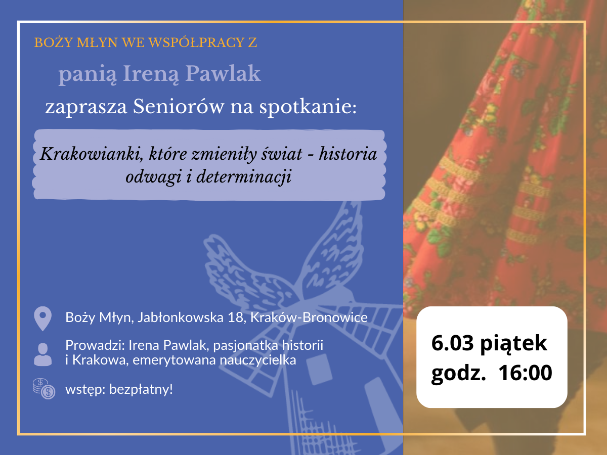 To spotkanie poświęcone niezwykłym kobietom XX wieku, których działania miały realny wpływ na bieg historii. Poznamy inspirujące sylwetki krakowianek, które swoją odwagą, talentem i determinacją wyprzedzały czasy, w których żyły.